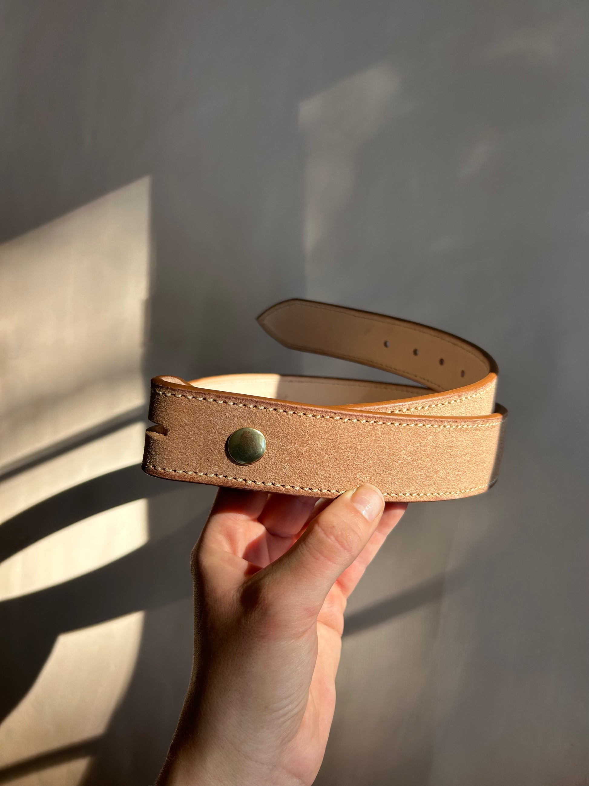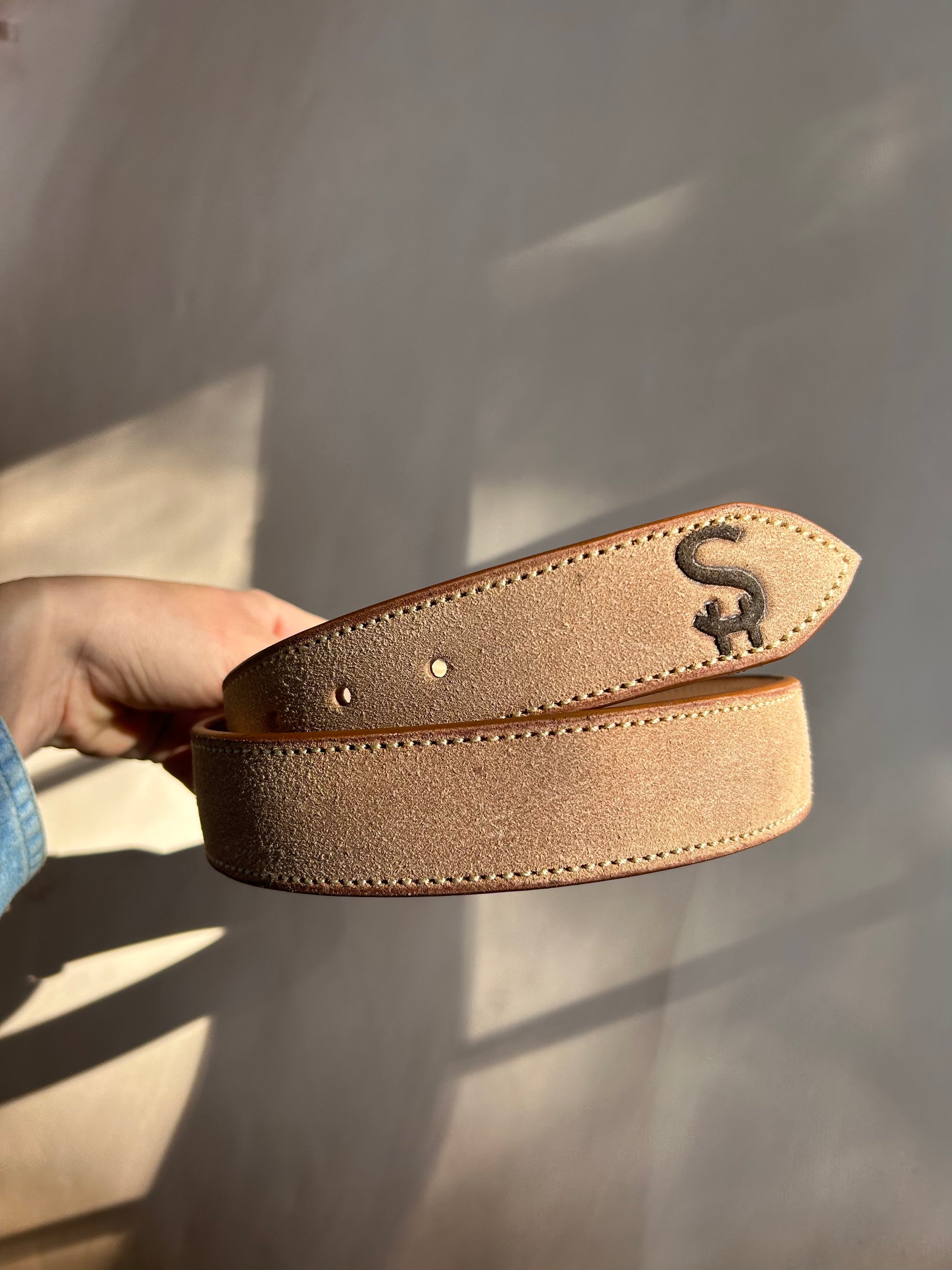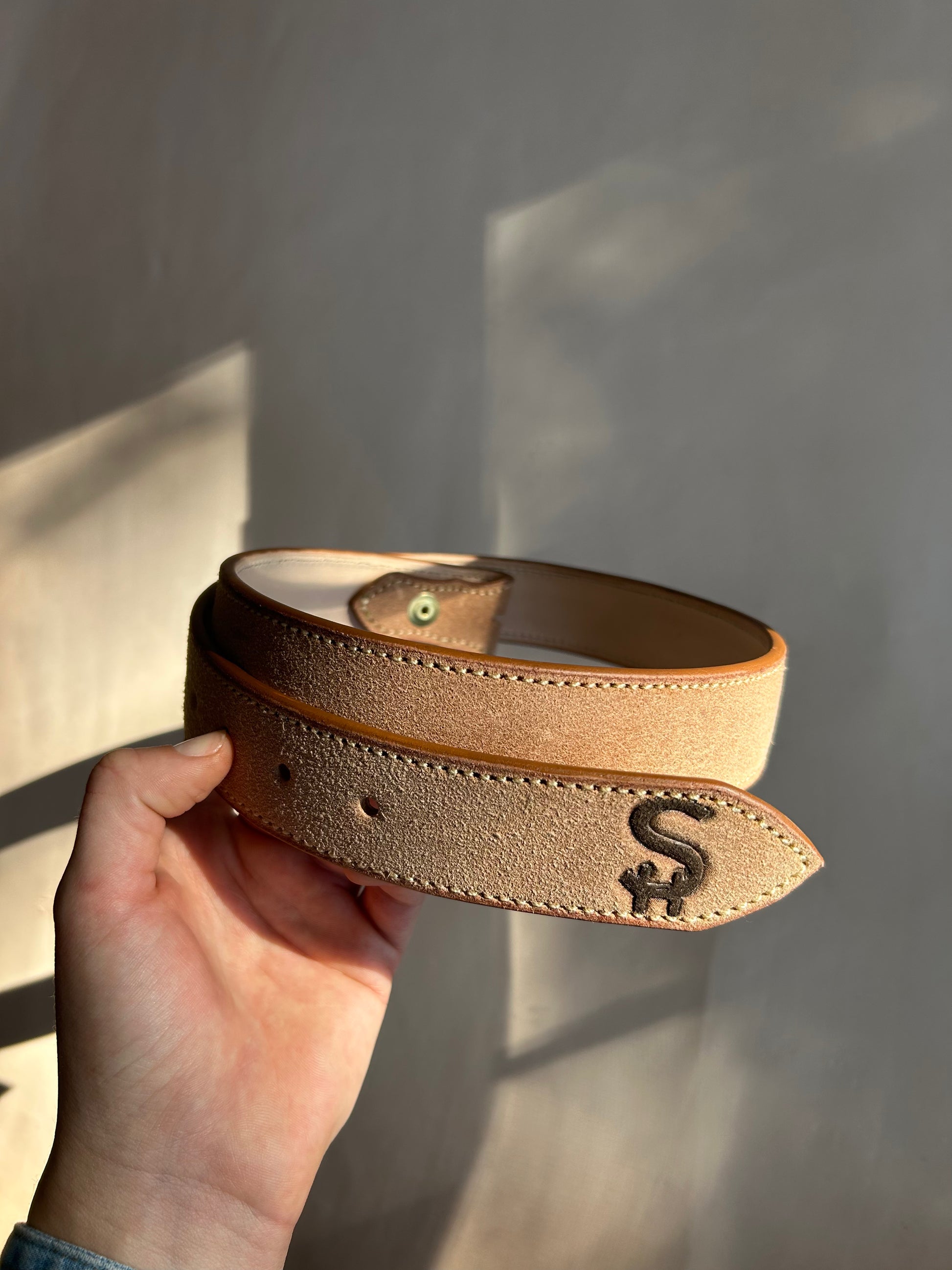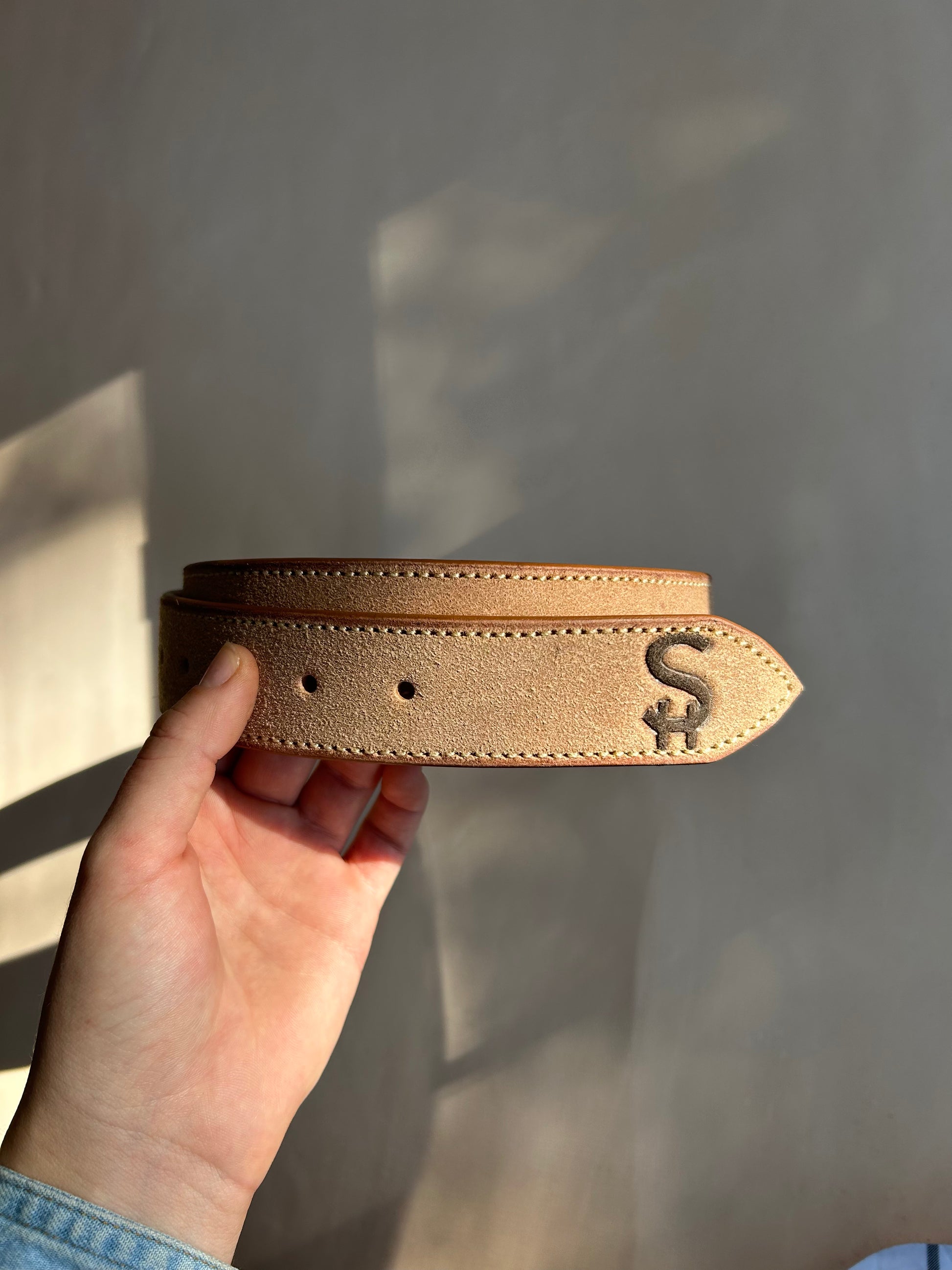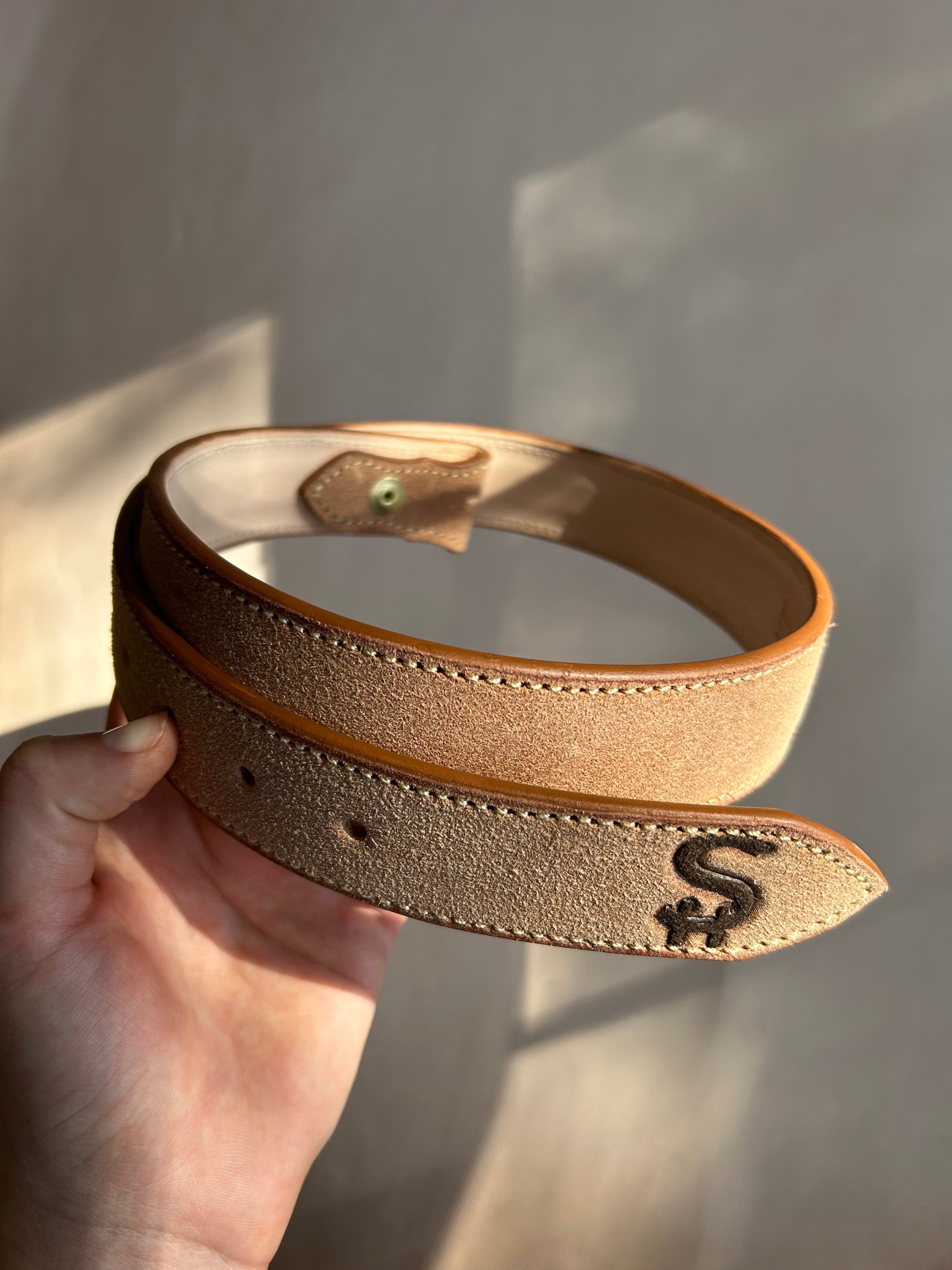 1.5 inch wide natural rough-out Hermann Oak leather with chocolate brown dyed initials/brand. Tan thread and brass buckle fold closure.